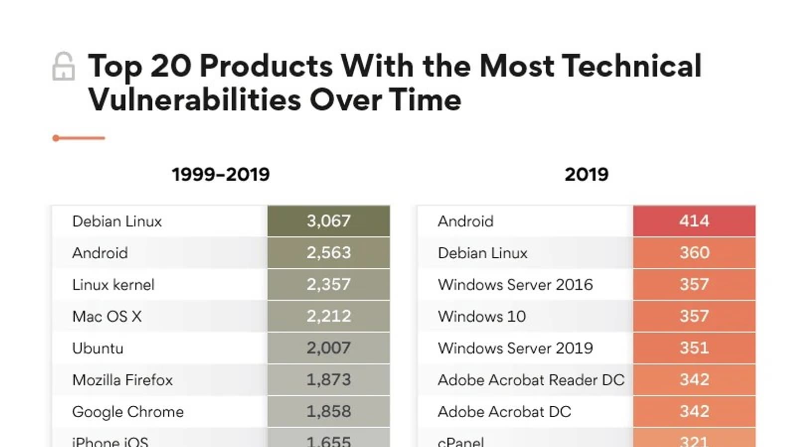 Лидером антирейтинга стала Android с 414 обнаруженными за год уязвимостями. На втором месте расположилась Debian Linux (360 уязвимостей), а третье поделили Windows Server 2016 и Windows 10 (357 уязвимостей).