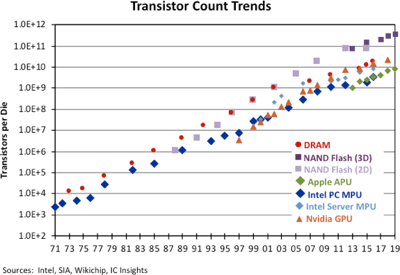 Хотя темпы роста в некоторых категориях полупроводниковых изделий замедлились, одна из формулировок закона Мура — удвоение количества транзисторов в расчете на одну микросхему каждые два года — остается ориентиром, которому продолжает следовать отрасль. Во всяком случае, в этом уверены аналитики IC Insights, подготовившие очередной отчет на эту тему. В нем отслеживается динамика за последние пять десятилетий в сегментах DRAM, флеш-памяти, микропроцессоров и графических процессоров. Во всех сегментах увеличение степени интеграции следует кривой, предсказанной Муром.