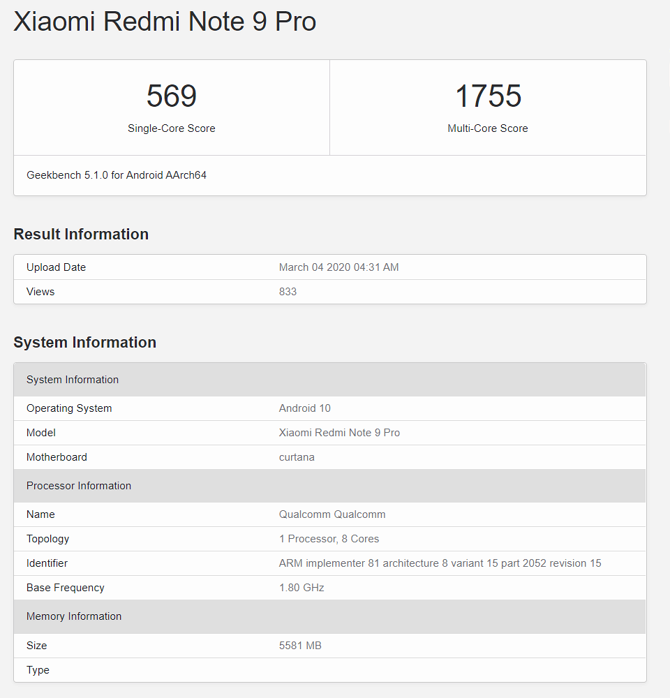 База данных Geekbench подтверждает ранние слухи о том, что Redmi Note 9 Pro будет основан на Snapdragon 720G — свежей и достаточно производительной однокристальной системе Qualcomm, близкой по своим параметрам к Snapdragon 730.