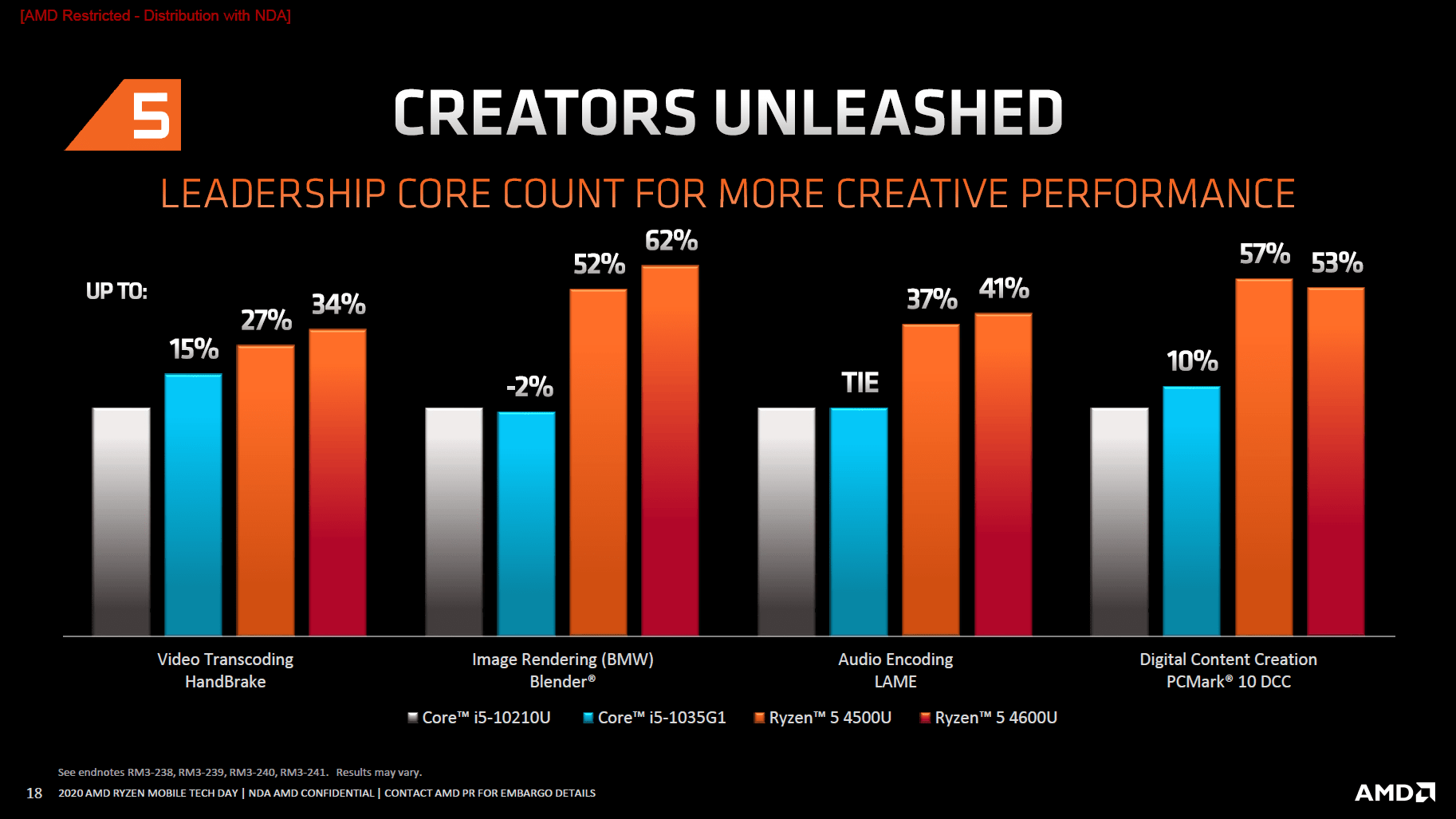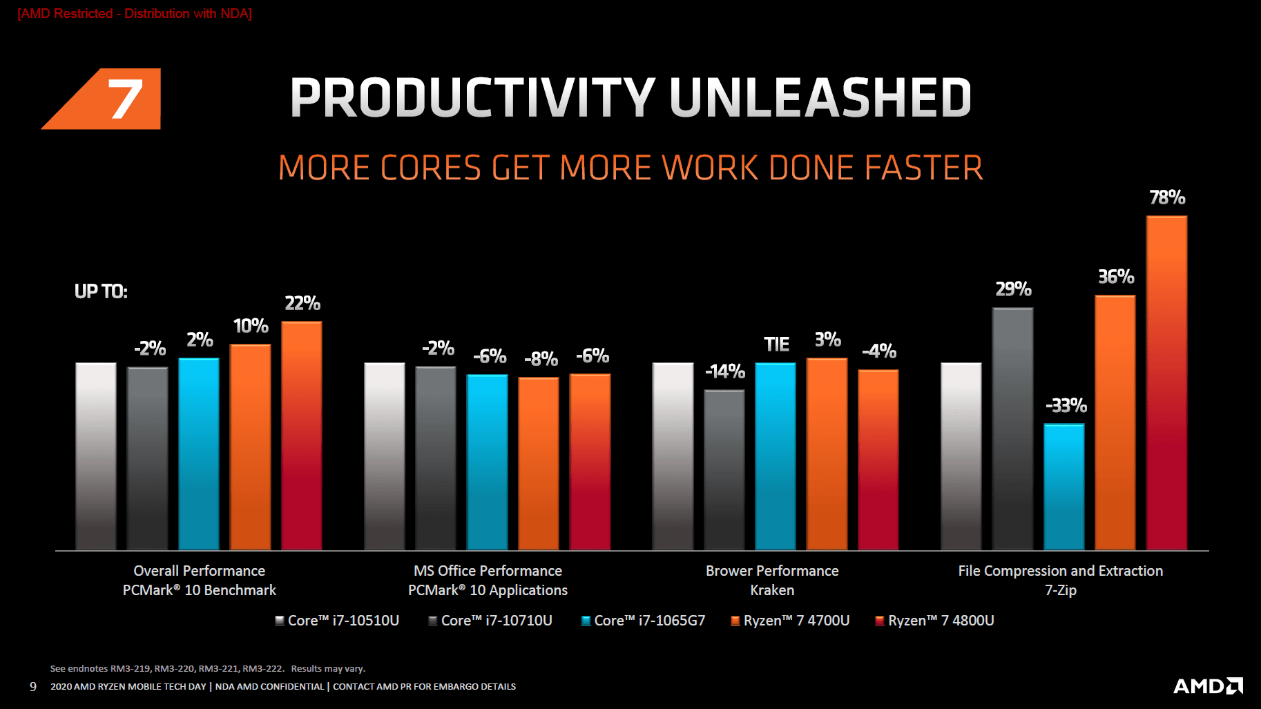 И теперь у нас есть официальные данные самой AMD относительно производительности новинок в сравнении с конкурентами. В данном случае на диаграммах присутствуют показатели как раз энергоэффективных топовых APU Ryzen 7 4800U и Ryzen 7 4700U. Напомним, оба располагают восемью ядрами, SMT поддерживает лишь старшая модель, частоты Ryzen 7 4800U равны 1,8-4,2 ГГц, Ryzen 7 4700U — 2,0-4,1 ГГц. У старшей модели в качестве GPU выступает Vega 8, у младшей — Vega 7.