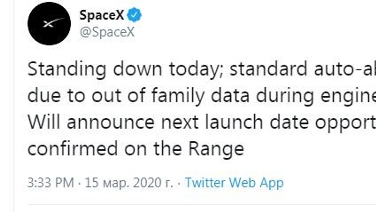 Компания SpaceX сообщила, что запуск ракеты-носителя Falcon-9, которая вчера должна была вывести на орбиту очередную партию спутников Starlink, снова отложен. Процедура запуска была прервана автоматически, когда в ходе проверки двигателя система обнаружила, что контрольные данные вышли за штатные пределы.