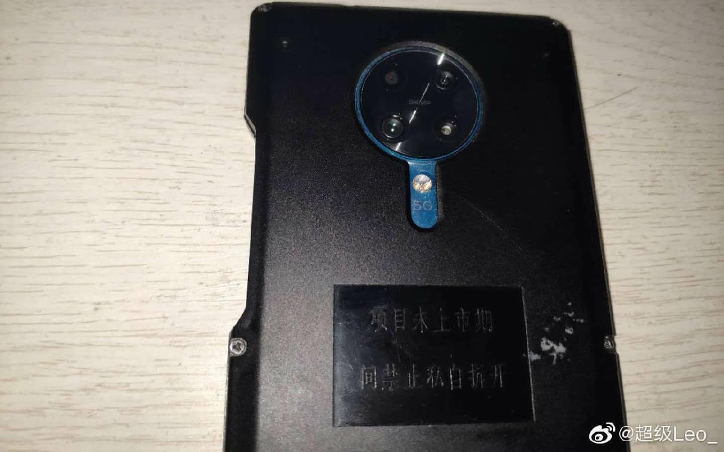 Фотографии подтверждают, что камера имеет четыре датчика изображения, которые размещены симметрично относительно друг друга в круглом блоке в верхней части задней панели. Надпись подтверждает, что разрешение основного датчика изображения составляет 64 Мп. Ниже располагается светодиодная вспышка и надпись, которая указывает на поддержку сетей пятого поколения.