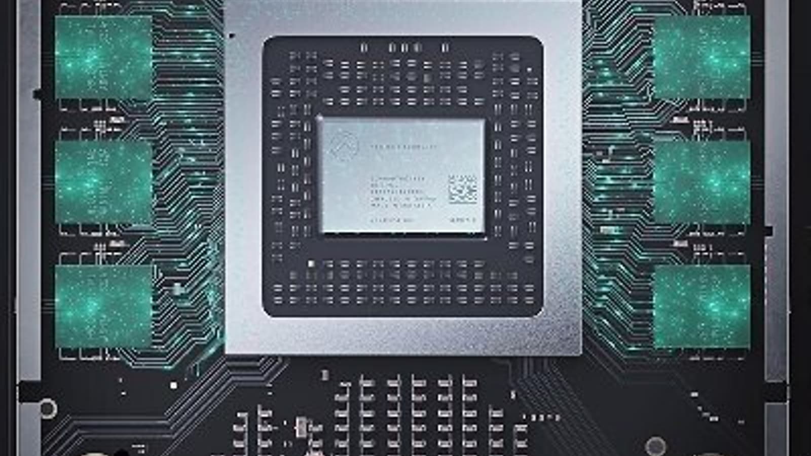 На снимке кристалл SoC находится в центре, а по трем сторонам от него — десять кристаллов памяти GDDR6. Ширина шины составляет 320 бит.