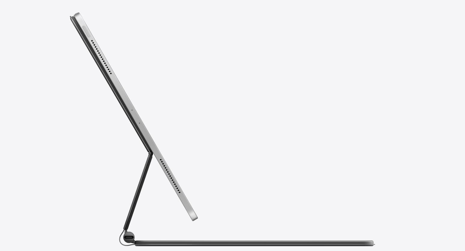 Конструкция клавиатуры такова, что позволяет настроить положение планшета в широких пределах, ещё больше приближая iPad к обычному ноутбуку. Стоит отметить, что Magic Keyboard располагает полноразмерной клавиатурой с ножничным механизмом и ходом клавиш в 1 мм. А ещё тут есть порт USB-C для зарядки планшета, причём разъём USB-C на самом планшете остаётся незанятым, так что его можно использовать для подключения накопителей или чего-то иного. Купить Magic Keyboard можно будет в мае.