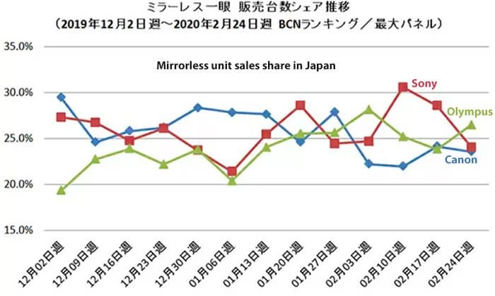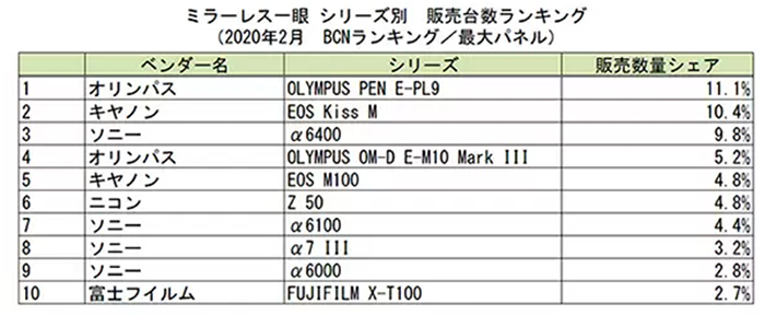В целом продажи беззеркальных камер в Японии в феврале 2020 года составили 76,5% продаж в феврале 2019 года.