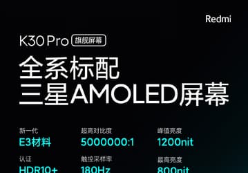E3 Super AMOLED, 180 Гц, 5 000 000:1, 1200 кд/м<SUP>2</SUP>, HDR10+. Такой дисплей получил Redmi K30 Pro
