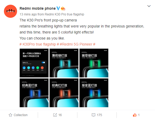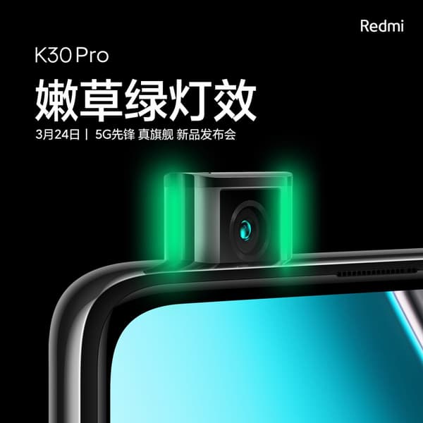 Утром мы уже сообщали, что Redmi K30 Pro позаимствовал у предшественников Redmi K20 и Redmi K20 Pro яркую подсветку выдвижного модуля с фронтальной камерой. На рендере подсветка была голубой, однако на самом деле пользователям на выбор будут доступны сразу пять цветовых вариантов.