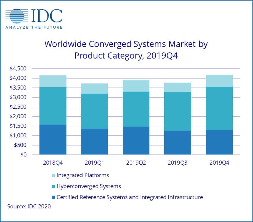 Специалисты аналитической компании IDC подвели итоги четвертого квартала 2019 года на рынке конвергентных систем. В подготовленном ими отчете сказано, что указанный рынок в годовом исчислении вырос на 1,1% и достиг 4,2 млрд долларов.