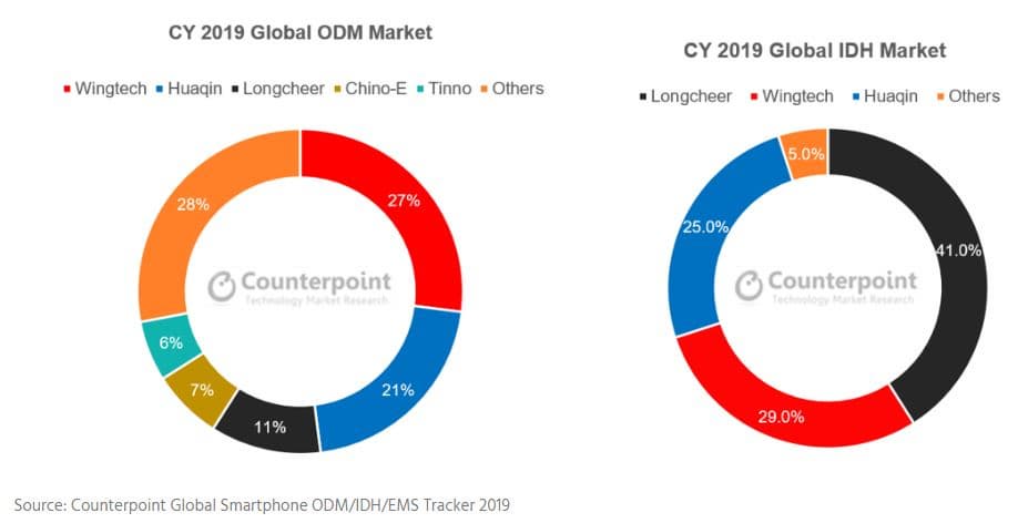 Среди ODM и IDH, работающих на рынке смартфонов, выделяются Wingtech, Huaqin и Longcheer. Их суммарная доля равна 68%. Распределение рынков ODM и IDH наглядно показано на диаграммах.