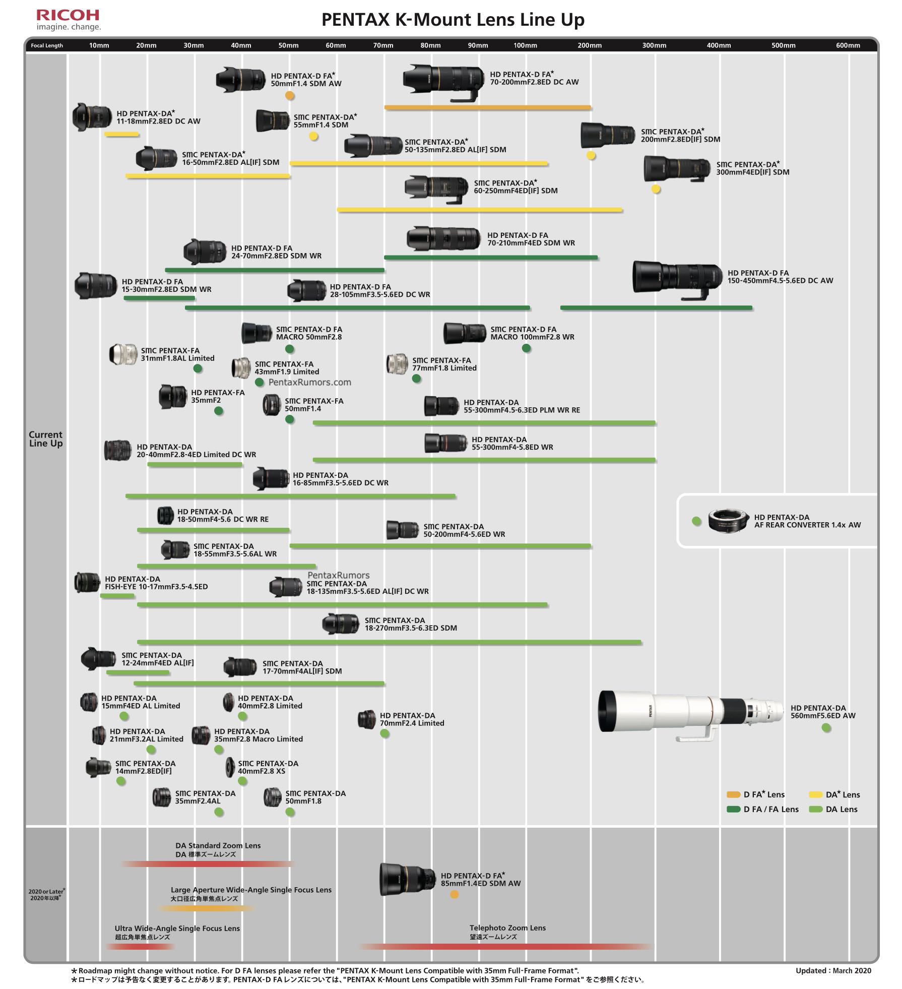 Источник опубликовал обновленный план выпуска объективов с креплением Pentax K. Наряду с общим планом опубликован план, включающий только полнокадровые модели. Таковых на период «2020 год или позже» в плане, отражающем положение дел на март 2020 года, насчитывается четыре. Среди них — модель HD Pentax-D FA*85mmF1.4 SDM AW, разработку которой недавно анонсировал производитель. Как известно, ее продажи должны начаться в конце текущего года.
