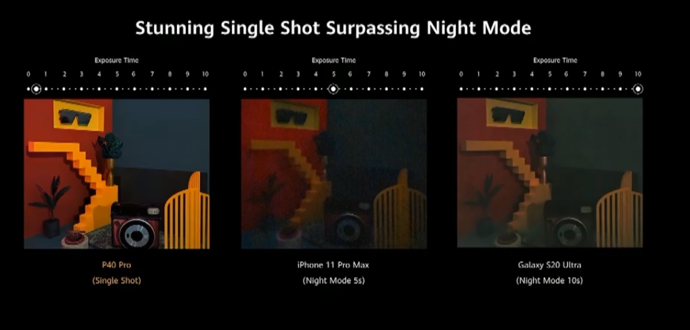Съёмка при плохом освещении должна быть ещё одним коньком новинок Huawei. Компания показала пример видео, снятый при освещённости в 0,5 люкса, и конкурирующие смартфоны в такой ситуации оказались почти слепы.