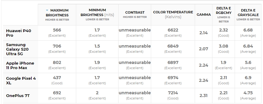 К примеру, дисплей Huawei P40 Pro далеко не самый яркий среди актуальных флагманов. Пиковое значение — 566 кд/м2. Для сравнения, у Samsung Galaxy S20 Ultra это 706 кд/м2, у iPhone 11 Pro Max — 802 кд/м2, а у OnePlus 7T — 692 кд/м2. По остальным показателям дисплей Huawei P40 Pro очень хорош, хотя и не лучший.