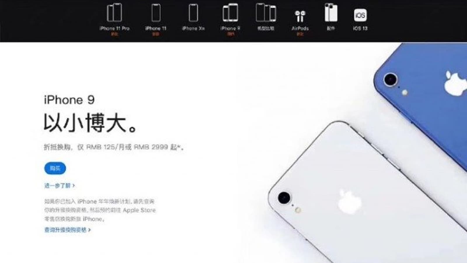 Сегодня на официальном китайском сайте Apple появилось изображение нового смартфона iPhone 9, который показан задней панелью в двух цветовых вариантах: сером и синем.