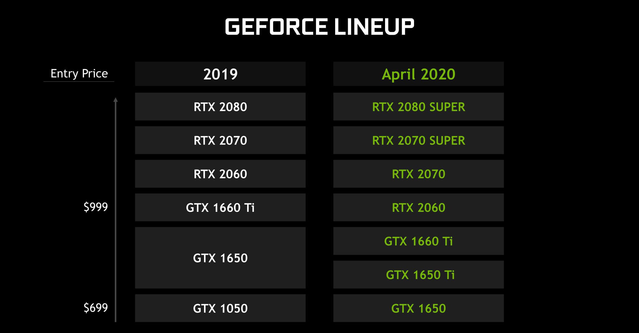 Начнём с того, что кроме GeForce RTX 2070 Super и RTX 2080 Super, как и ожидалось, представили также GeForce GTX 1650 Ti и её версию Max-Q, а вот RTX 2060 так и не обновили, хотя такие слухи были.