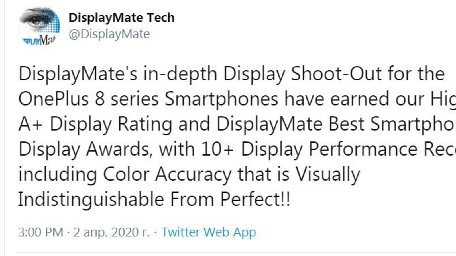 Как известно, смартфон OnePlus 8 представят 14 апреля. Тем временем специалисты компании DisplayMate Technologies уже назвали его дисплей лучшим. Точнее говоря, в сообщении DisplayMate, опубликованном в Twitter, сказано, что дисплей получил максимальную оценку A+, награду Best Smartphone Display и по точности цветопередачи «неотличим от идеала».