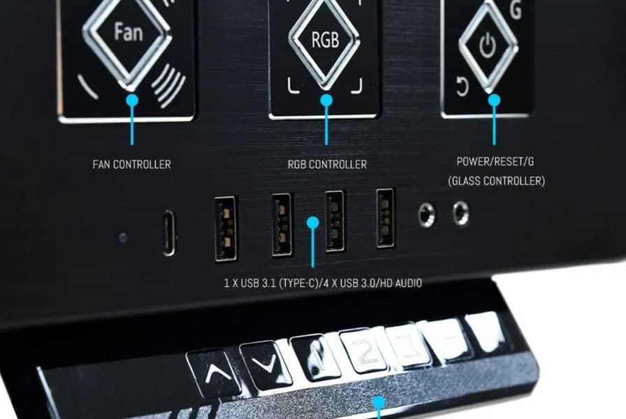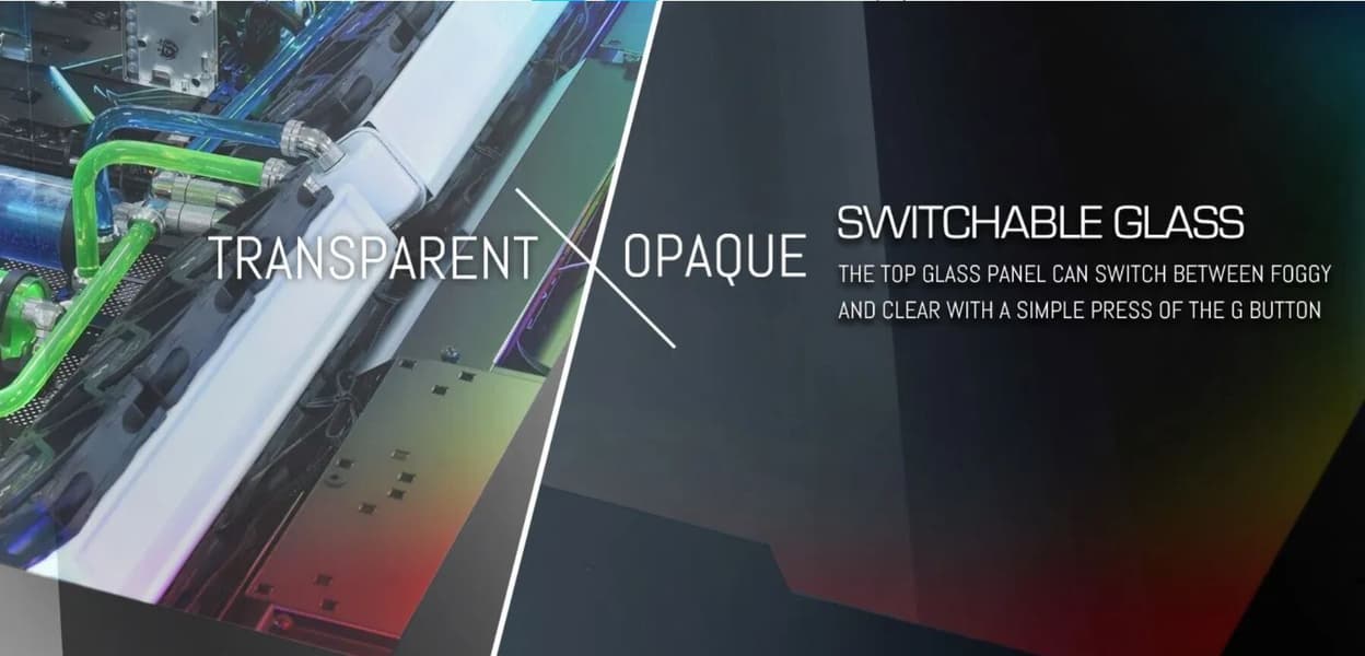 Такое стекло можно встретить в офисах, зеркалах заднего вида в автомобилях и иллюминаторах пассажирских самолетов. Его особенностью является возможность изменять способность пропускать или рассеивать свет. В корпусах Lian Li серии DK, меняя прозрачность стекла, можно делать видимыми компоненты системы или превращать столешницу в рассеиватель для светодиодной подсветки, которой они украшены. Каркас стеклянной крышки тоже может быть украшен полосами ARGB. Кнопка, регулирующая прозрачность, расположена на панели управления, рядом с кнопками для управления вентиляторами и подсветкой.