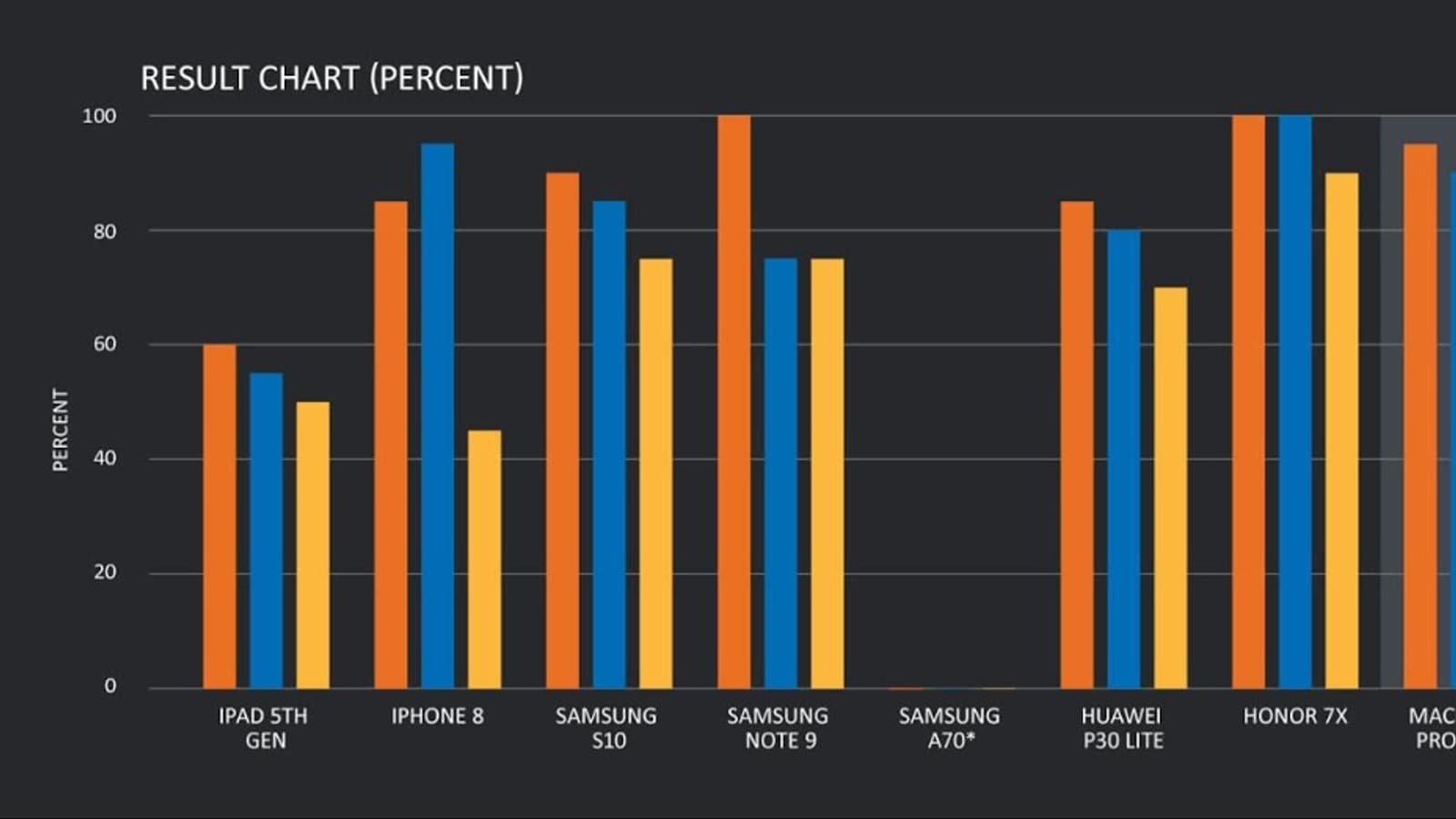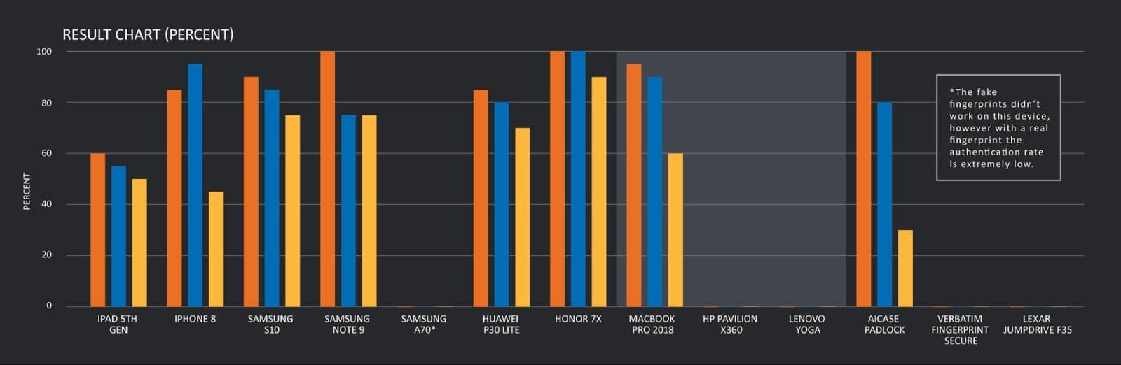 На диаграммах ниже оранжевая линия — это процент успеха при прямом получении отпечатка пальца, синяя — при цифровом оригинале, жёлтая — при сборе отпечатка с предметов. Показатель рассчитывался на основе 20 попыток для каждого устройства с лучшим поддельным отпечатком из тех, что удалось создать источнику.