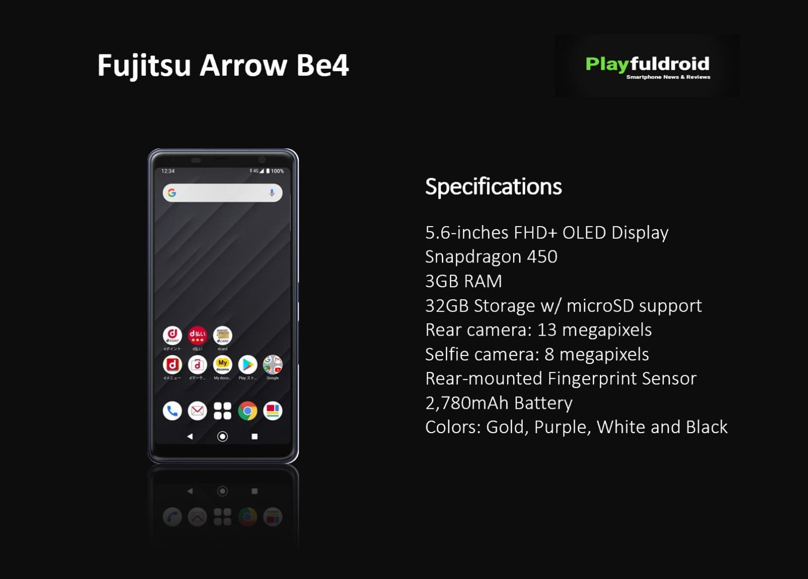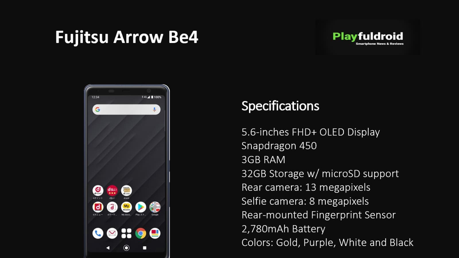 Fujitsu Arrow Be4 оснащен экраном OLED диагональю 5,6 дюйма разрешением FullHD+, однокристальной системой Qualcomm Snapdragon 450, всего 3 ГБ оперативной и 32 ГБ энергонезависимой флэш-памяти. Также предусмотрен слот для установки карт памяти.