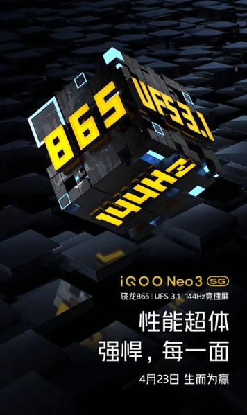 Ранее сообщалось, что iQOO Neo 3 5G получит экран с частотой обновления изображения 120 Гц, однако, согласно новой информации, максимальная частота обновления экрана составит 144 Гц. Слоган нового смартфона — «рожденный побеждать».