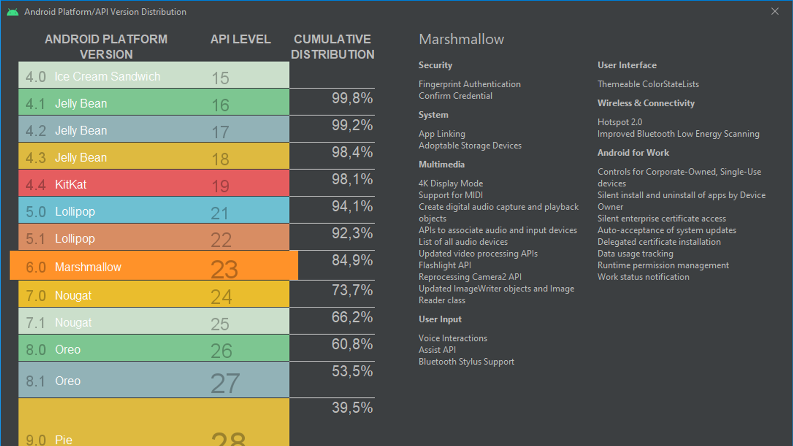 Если кратно, показатель возле каждой версии указывает разработчикам на то, какой процент устройств на рынке работает с Android версией не ниже выбранной. То есть 39,5% возле Android Pie указывают на то, что 39,5% устройств на рынке работаю под управлением Android Pie и Android 10. И мы понимаем, что последняя сейчас занимает лишь 8,2%. Соответственно, доля Android Pie — 31,3%, то есть именно эта версия является самой распространённой на данный момент.