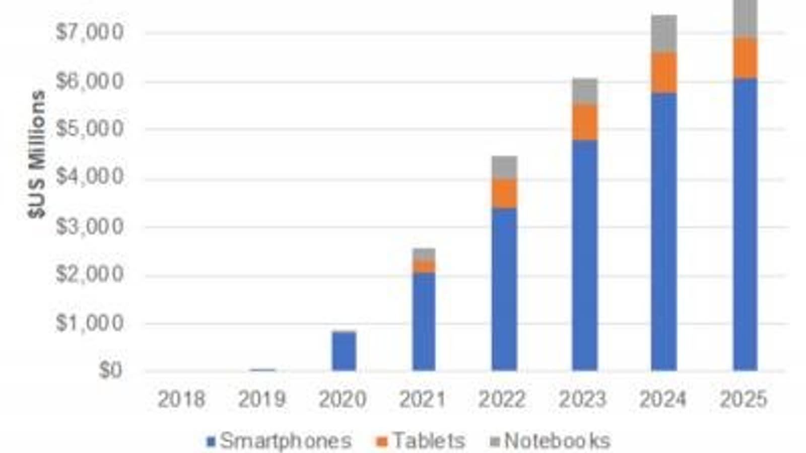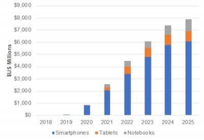 В DSCC ожидают, что поставки устройств со складными экранами OLED начнут расти уже во второй половине текущего года. Всего в 2020 году будет выпущено около 5 млн устройств со складными экранами (в основном — смартфонов) на сумму почти 1 млрд долларов. В период с 2020 по 2025 год поставки складных дисплеев будут расти в среднем на 132% в год. Если этот прогноз оправляется, в 2025 году складных дисплеев будет отгружено 77 млн штук. В денежном выражении рынок достигнет почти 8 млрд долларов, что соответствует среднегодовому росту на 113%. Постепенно к смартфонам со складными дисплеями добавятся планшеты и ноутбуки со складными дисплеями.