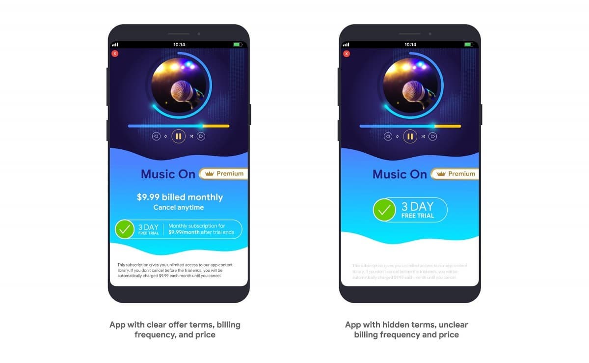 Google требует от разработчиков, чтобы пользователи могли легко найти и понять условия подписки, информацию о бесплатном пробном периоде и других вводных предложениях. Чётко и прямо должна быть обозначена цена и частота оплаты, продолжительность бесплатных сервисов, что в них включено, срок окончания и необходимые действия для отмены. На внедрение требований разработчикам дан срок до 16 июля 2020 года.