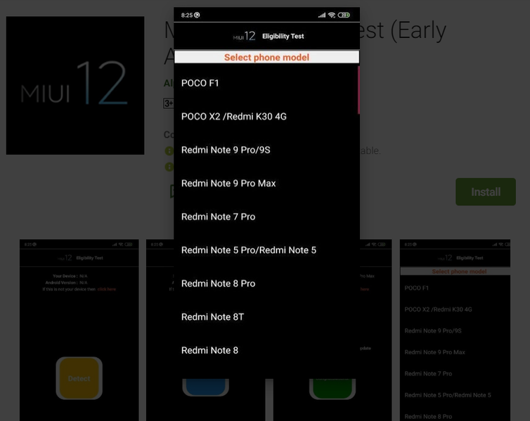 После установки предлагается определить устройство, нажав на кнопку Detect. Если устройство «определено», то следует стадия проверки с кнопкой Check. Затем выдаётся результат — совместим или несовместим смартфон с MIUI 12. Если же устройство «определить» не удалось, то предлагается список из моделей Poco, Redmi и Xiaomi для выбора вручную.