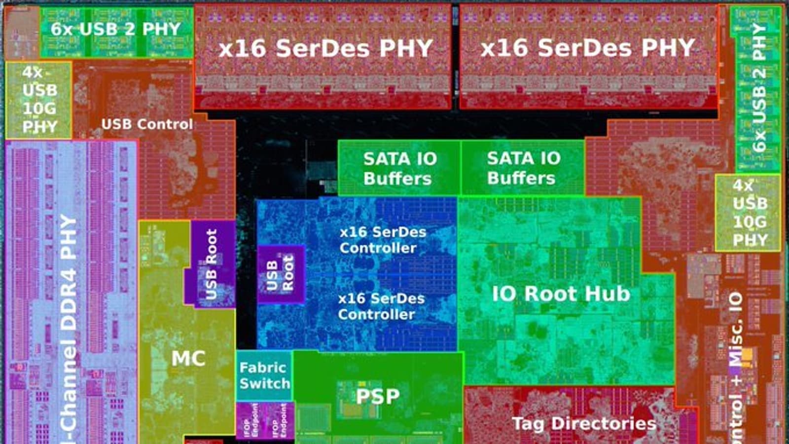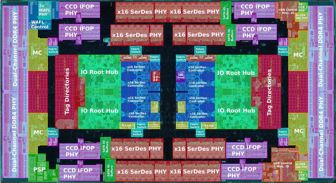 К ключевым узлам cIOD относятся последовательно-параллельные и параллельно-последовательные преобразователи (SerDes), которые вкупе с контроллерами и интерфейсами физического уровня (PHY) образуют PCIe, SATA, USB 3 и другие высокоскоростные последовательные интерфейсы. Эта структура является программируемой, что позволяет проектировщикам конфигурировать необходимый набор интерфейсов. На чиплете cIOD процессора Matisse видны два контроллера SerDes x16 и корневой концентратор ввода/вывода, а также два конфигурируемых блока PHY SerDes x16, в то время как у cIOD Rome в четыре раза больше контроллеров SerDes и в восемь раз больше PHY. Отметим, что в случае процессоров Castle Peak (Ryzen Threadripper 3-го поколения) половина SerDes, контроллеров памяти и PHY отключена. Все компоненты cIOD связаны внутренним соединением Infinity Fabric. У Matisse есть два интерфейса IFOP (Infinity Fabric over Package) для связи с процессорными чиплетами Zen 2, а у Rome — восемь таких интерфейсов и интерфейс IFIS (Infinity Fabric Inter-Socket) для связи с другим процессором в системной плате с двумя процессорными разъемами.