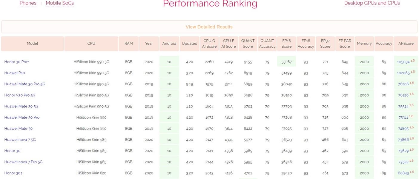Если говорить точнее, то на данный момент 11 первых мест в рейтинге AI Benchmark занимают мобильные телефоны Huawei и Honor, а недавно выпущенный Honor 30 Pro+ поднялся на первое место. Huawei P40 занимает второе место, на третьем находится прошлогодний флагман Huawei Mate 30 Pro 5G.