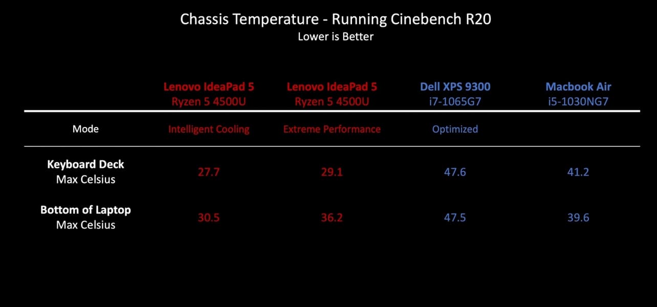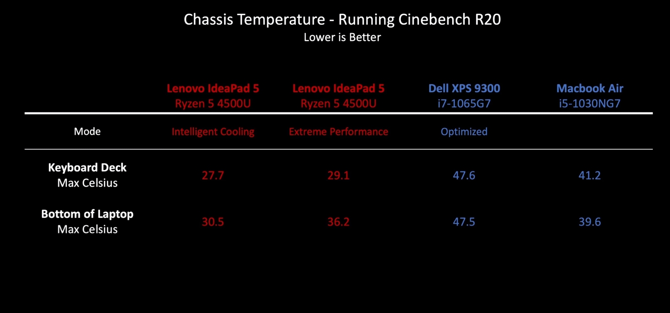 Также стоит отметить существенно меньшее энергопотребление и нагрев процессора AMD. Правда, тут стоит отметить, что это в режиме Intelligent Cooling, но именно он является оптимальным, так как режим Extreme Perfomance существенно повышает энергопотребление (как раз до уровня Core i7-1065G7) и нагрев, а вот производительность увеличивается незначительно.