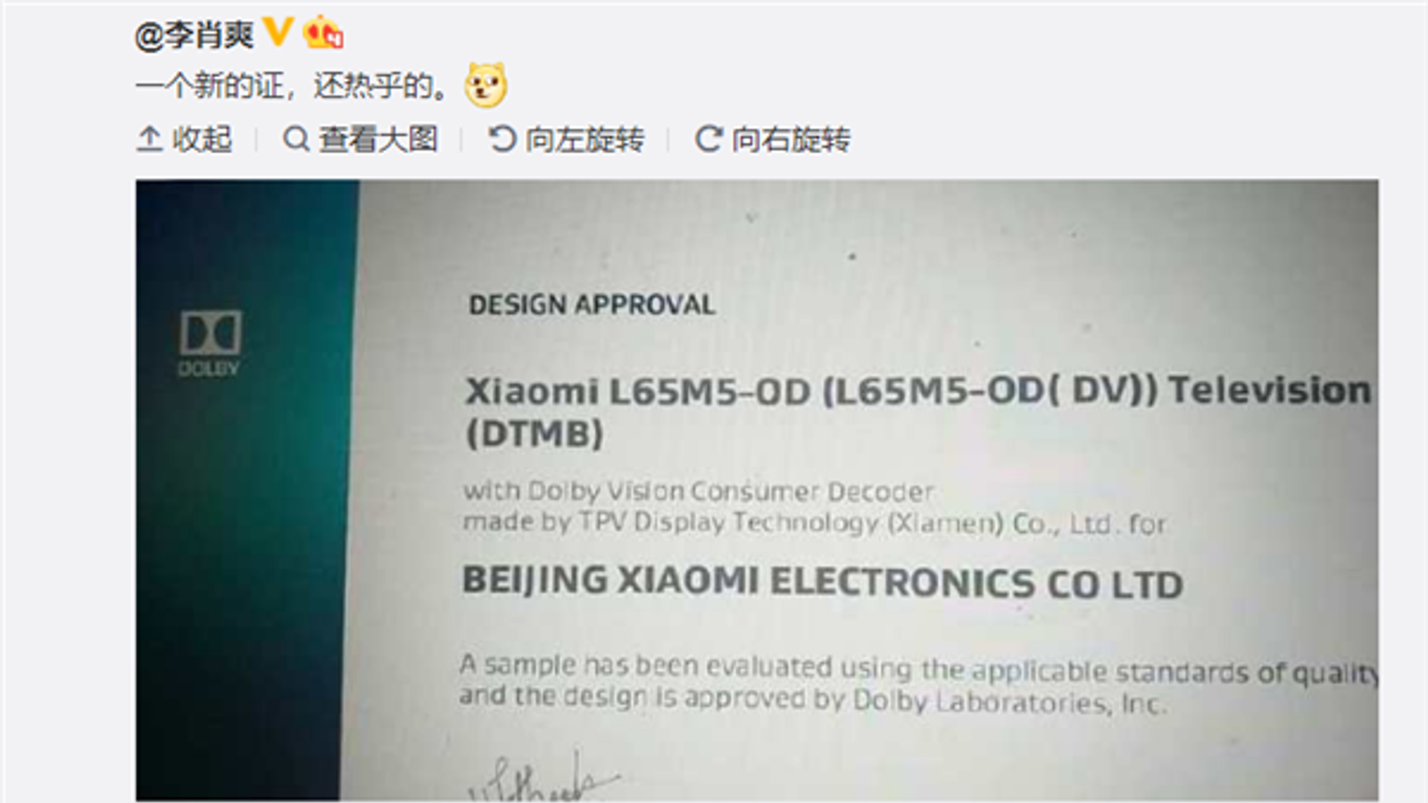 Генеральный директор телевизионного отдела Xiaomi Ли Сяошуан (Li Xiaoshuang) поделился фотографией в своем официальном аккаунте Weibo. Если посмотреть на изображение, то можно увидеть продукт под названием L65M5-OD, который только что прошел сертификацию Dolby Vision. При ближайшей рассмотрении видно, что телевизор поддерживает китайский стандарт цифрового телевидения DTMB, также назван производитель, которым выступает TPV Display Technology (Xiamen). Диагональ дисплея составляет 65 дюймов.