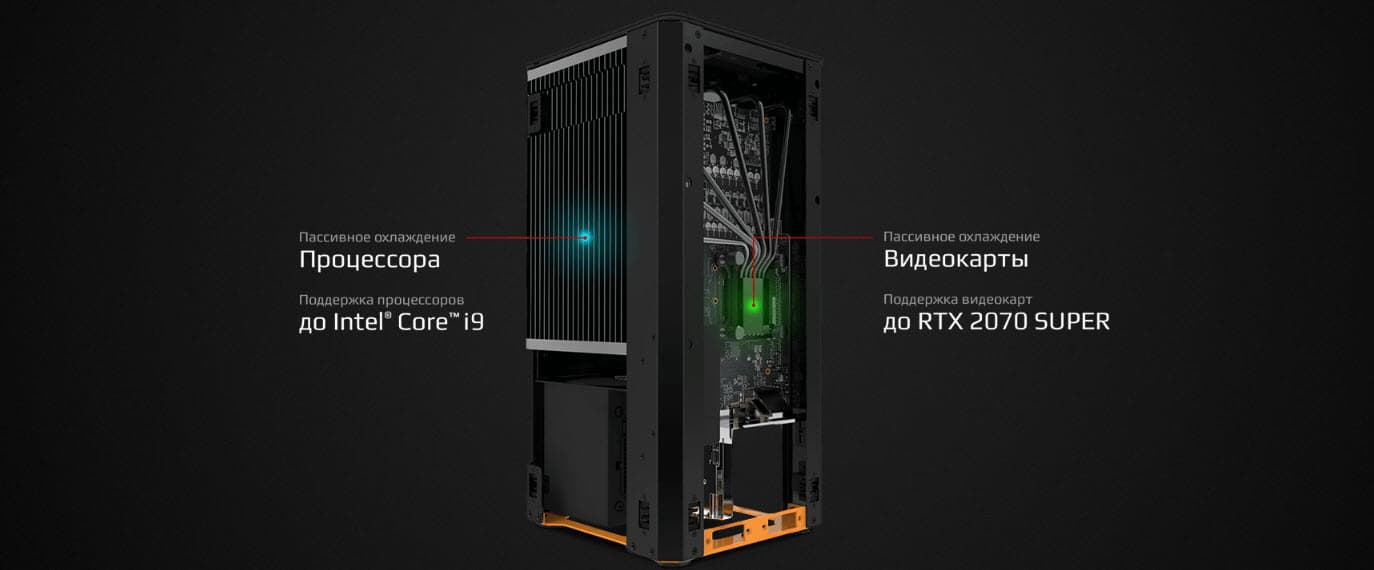 Команда инженеров HyperPC хотела создать компьютер, который будет очень производительным и при этом бесшумным, поэтому сразу было решено использовать исключительно пассивные компоненты теплоотвода. Для этого был использован единый огромный радиатор, который охлаждает видеокарту Nvidia GeForce RTX 2070 и процессор Intel Core i9-10900.