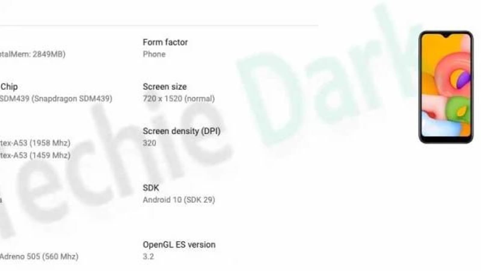 Подробности об оснащении взяты из базы Google Play Console — по сути, официального источника. Также аппарат получил большой дисплей диагональю 6,4 дюйма (но разрешение всего лишь HD+), 3 ГБ оперативной памяти и ОС Android 10, поверх которой, скорее всего, будет установлен интерфейс One UI 2.0. Небольшое изображение смартфона демонстрирует дисплей с каплевидным вырезом для фронтальной камеры. Больше о смартфоне ничего не сообщается, но можно надеяться на использование аккумулятора большой емкости — это особенность всех моделей серии Galaxy M. А еще наверняка будет камера из пары датчиков.