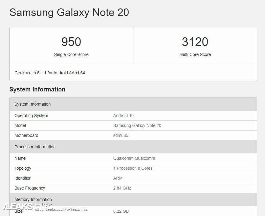Как хорошо видно на картинке, Galaxy Note20 получил Snapdragon 865 – такую же платформу, что используется в Galaxy S20. В наличии в этой модели ОС Android 10 можно было не сомневаться, а вот объем оперативной памяти выглядит интересно – 8,22 ГБ. Можно думать, что у Galaxy Note20 будут варианты с 10, 12 и 16 ГБ ОЗУ.