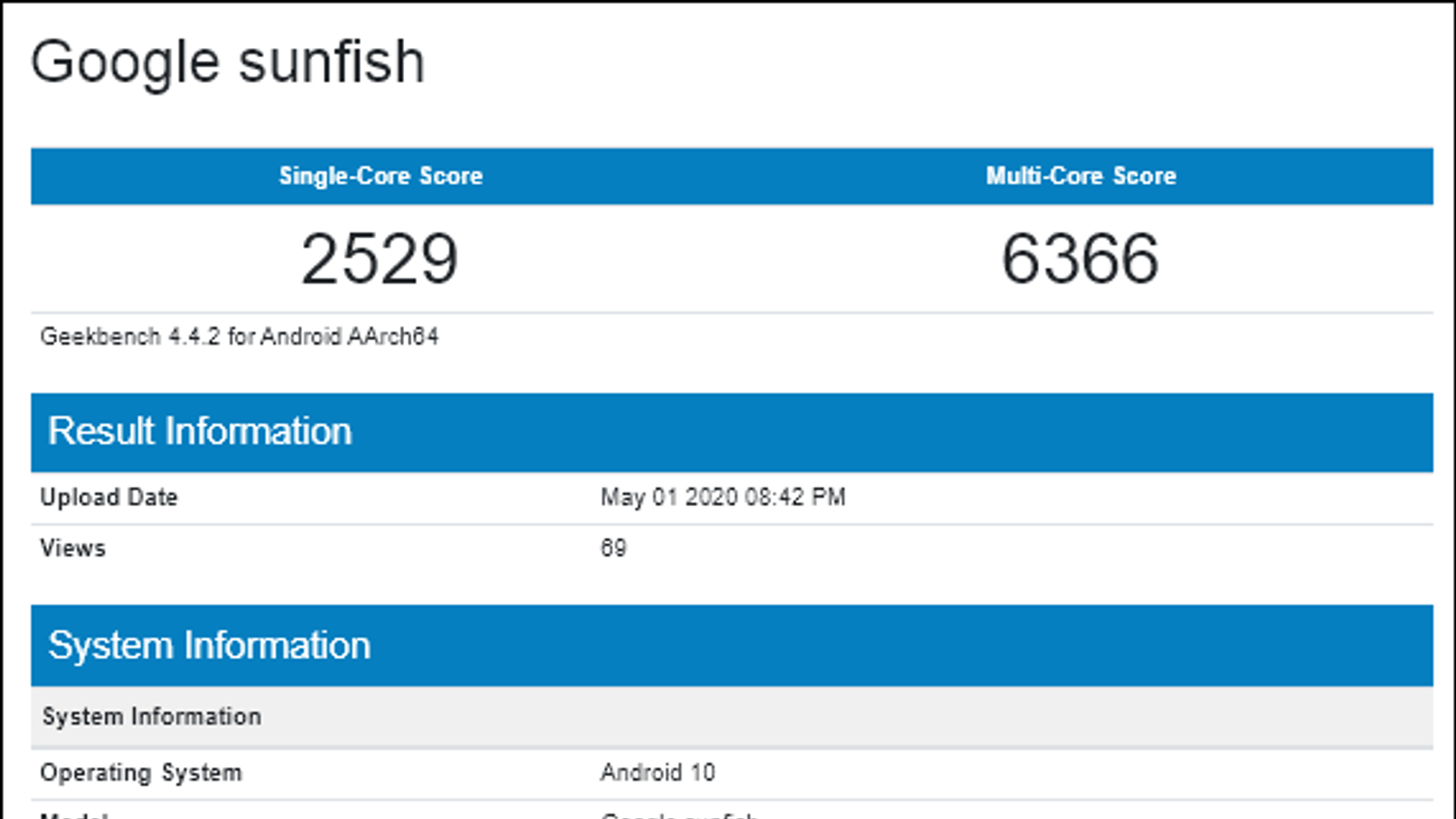 В Geekbench 4 смартфон «заработал» всего 2529 баллов в однопоточном тесте и 6366 баллов в многопоточном. Это примерно половина от того, на что способны нынешние флагманы. Название платформы, на которой построен Pixel 4A, бенчмарком не конкретизируется, но скорее всего использована Snapdragon 730, которой скоро уже исполнится год. Объем оперативной памяти, как видно, составил 6 ГБ, а в качестве ОС выступает Android 10.