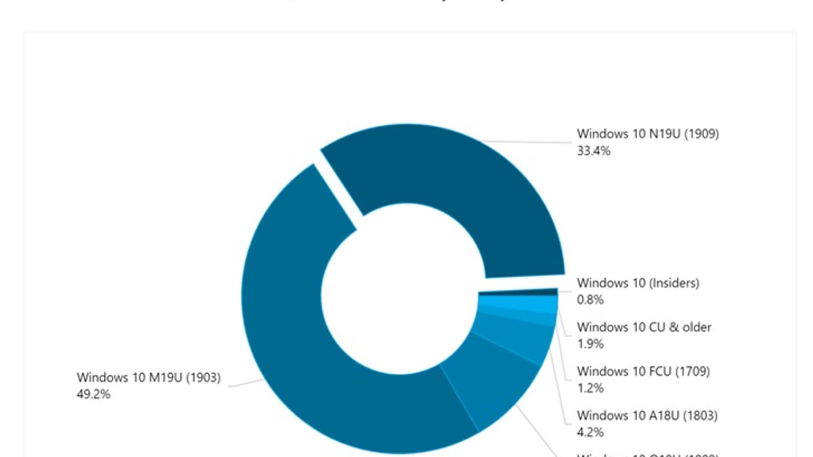 На втором месте версия с ноябрьским обновлением от 2019 года — оно установлено на 33,4% компьютеров. На третьем и четвертом местах — билды с позапрошлогодними обновлениями за версиями 1809 и 1803, их доля составляет, соответственно, 9,3% и 4,2%.