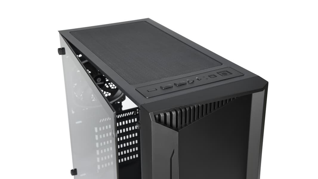 На передней стенке корпуса закреплен 120-миллиметровый вентилятор. Всего там помещается до трех 120-миллиметровых или до двух 140-миллиметровых вентиляторов. Сверху можно закрепить один или два 120-миллиметровых или 140-миллиметровых вентилятора. На задней стенке производитель устанавливает 120-миллиметровый вентилятора SquA RGB с подсветкой. Подсветкой также украшена передняя панель. Особенностью корпуса является встроенный контроллер-концентратор подсветки, рассчитанный на подключение до шести устройств с подсветкой ARGB и совместимы с системами управления подсветкой Asus, Asrock, MSI и Gigabyte. В качестве альтернативы программному обеспечению из комплекта системной платы можно использовать кнопку управления подсветкой, которая вынесена на панель ввода-вывода, где также можно увидеть прикрытые заглушками разъемы двух портов USB 3.0 и звуковые разъемы.