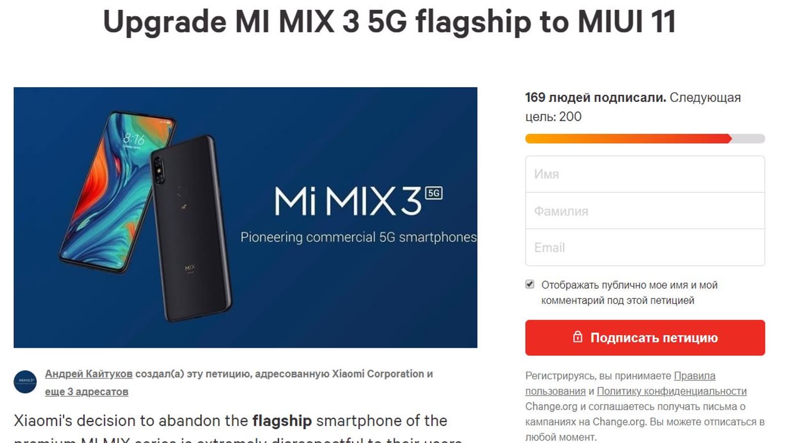 Xiaomi сложно упрекнуть в неадекватной программной поддержке своих смартфонов, но с некоторыми моделями случаются неприятные исключения. К примеру, Mi A3 получил работоспособную версию Android 10 только с четвертого раза, а недавний флагман Mi Mix 3 5G до сих пор обходится MIUI 10 на базе Android 9! И это при том, что, например, тот же Mi 8 уже давно обзавелся MIUI 11 на базе Android 10. Само собой, пользователей Mi Mix 3 такое положение вещей не могло устраивать, результатом чего стала петиция на сайте Change.org.