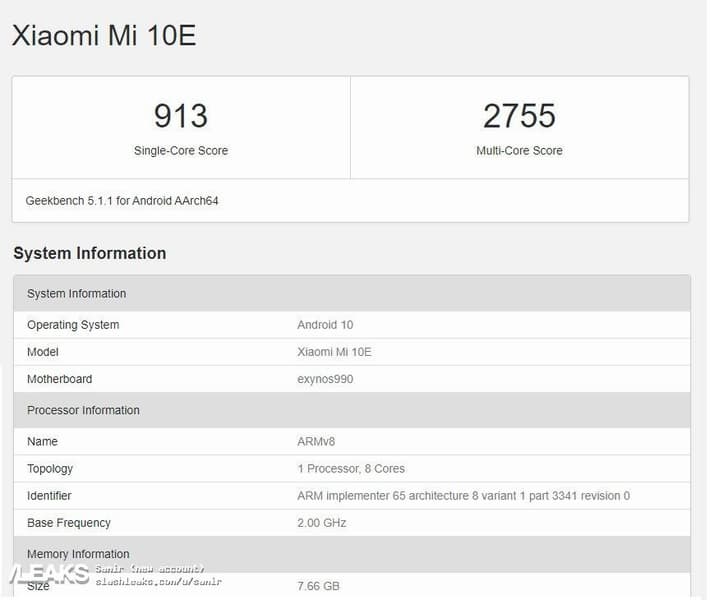 Вчера популярный ресурс Slashleaks, специализирующийся на разного рода утечках, запустил на просторы интернета скриншот с якобы результатами бенчмарка Geekbench смартфона Xiaomi Mi 10E.