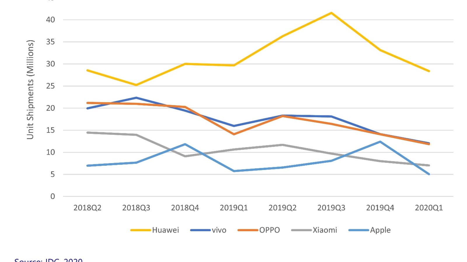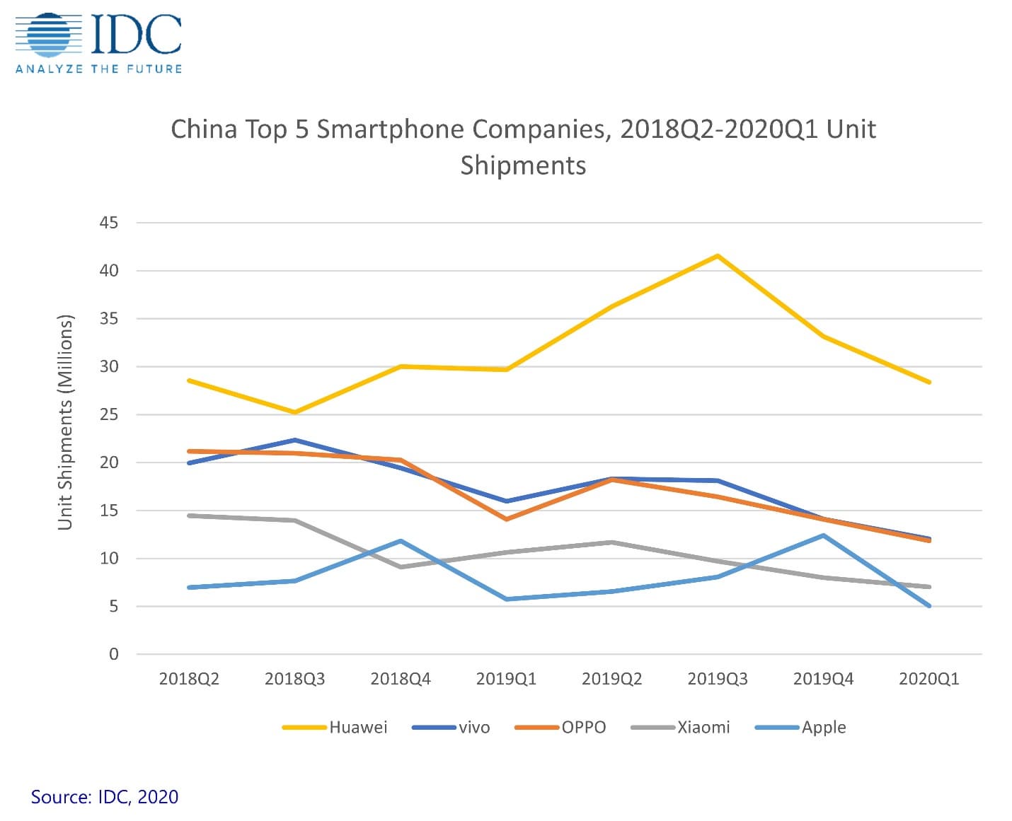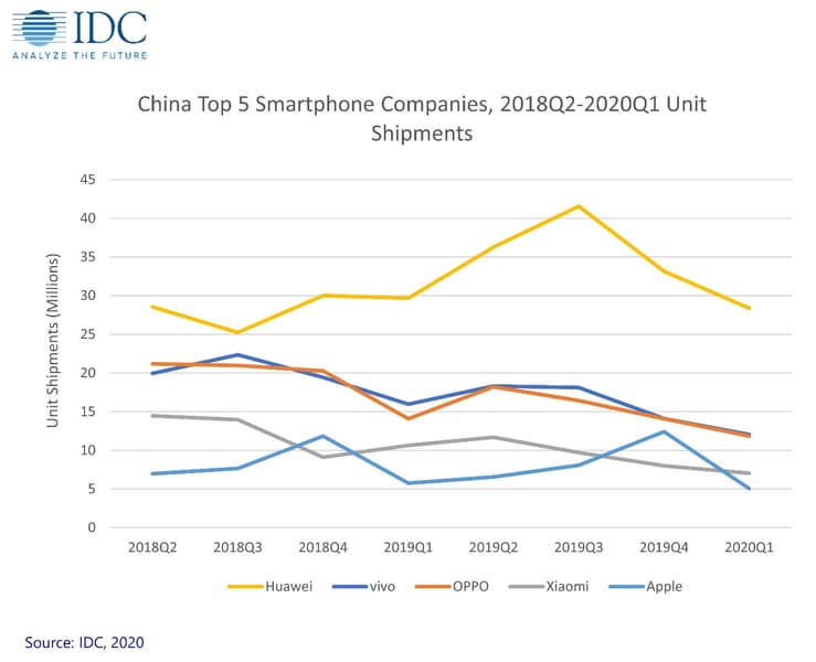 Аналитики IDC подвели итоги первого квартала 2020 года на китайском рынке смартфонов — крупнейшем рынке смартфонов в мире. За отчетный период здесь было отгружено 66,6 млн устройств, что на 20,3% меньше чем в первом квартале 2019 года, когда объем поставок был равен 83,6 млн штук. Это наибольший спад за всю историю китайского рынка смартфонов. Он объясняется сбоями в цепочке поставок и падением спроса из-за пандемии COVID-19.