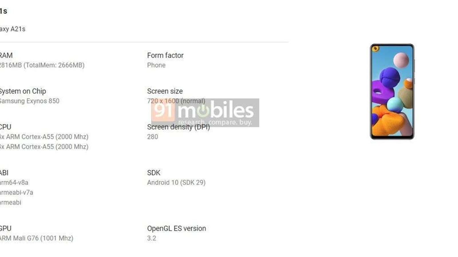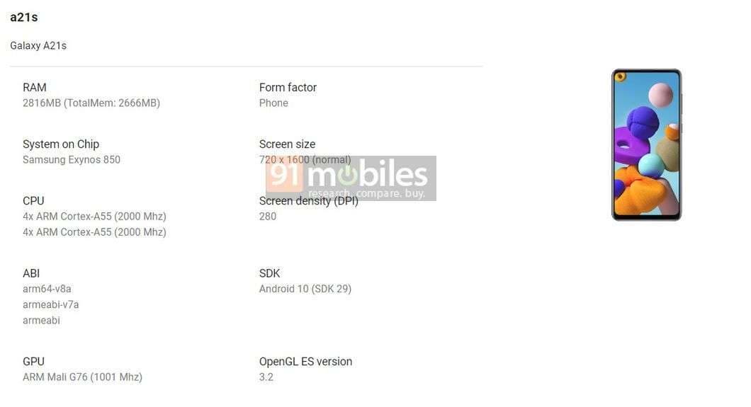 Но более всего нам интересна платформа — Exynos 850. Впервые Galaxy A21s засветился с этой SoC в базе Geekbench около месяца назад. Тогда мы узнали, что платформа имеет восемь ядер с частотой до 2 ГГц и демонстрирует производительность чуть выше, чем у Snapdragon 450. База Google подтверждает название SoC, её частоту, а также говорит нам о конфигурации: два кластера по четыре ядра Cortex-A55 и GPU Mali-G76 в неизвестной конфигурации.