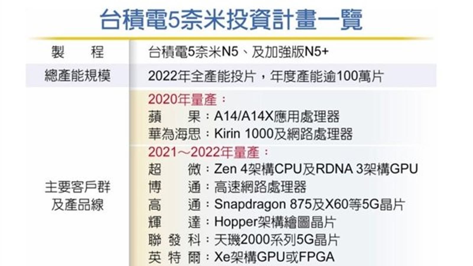 В Сети появилась дорожная карта, демонстрирующая продукты, которые будут производиться TSMC с применением 5-нанометрого техпроцесса. Выпуск небольших партий стартует уже в этом году: ожидается, что первыми решениями станут однокристальные системы Apple A14/A14X и Huawei Kirin 1000 для смартфонов. А вот в следующем году будет налажено масштабное производство CPU, SoC и GPU по техпроцессу 5 нм N5.