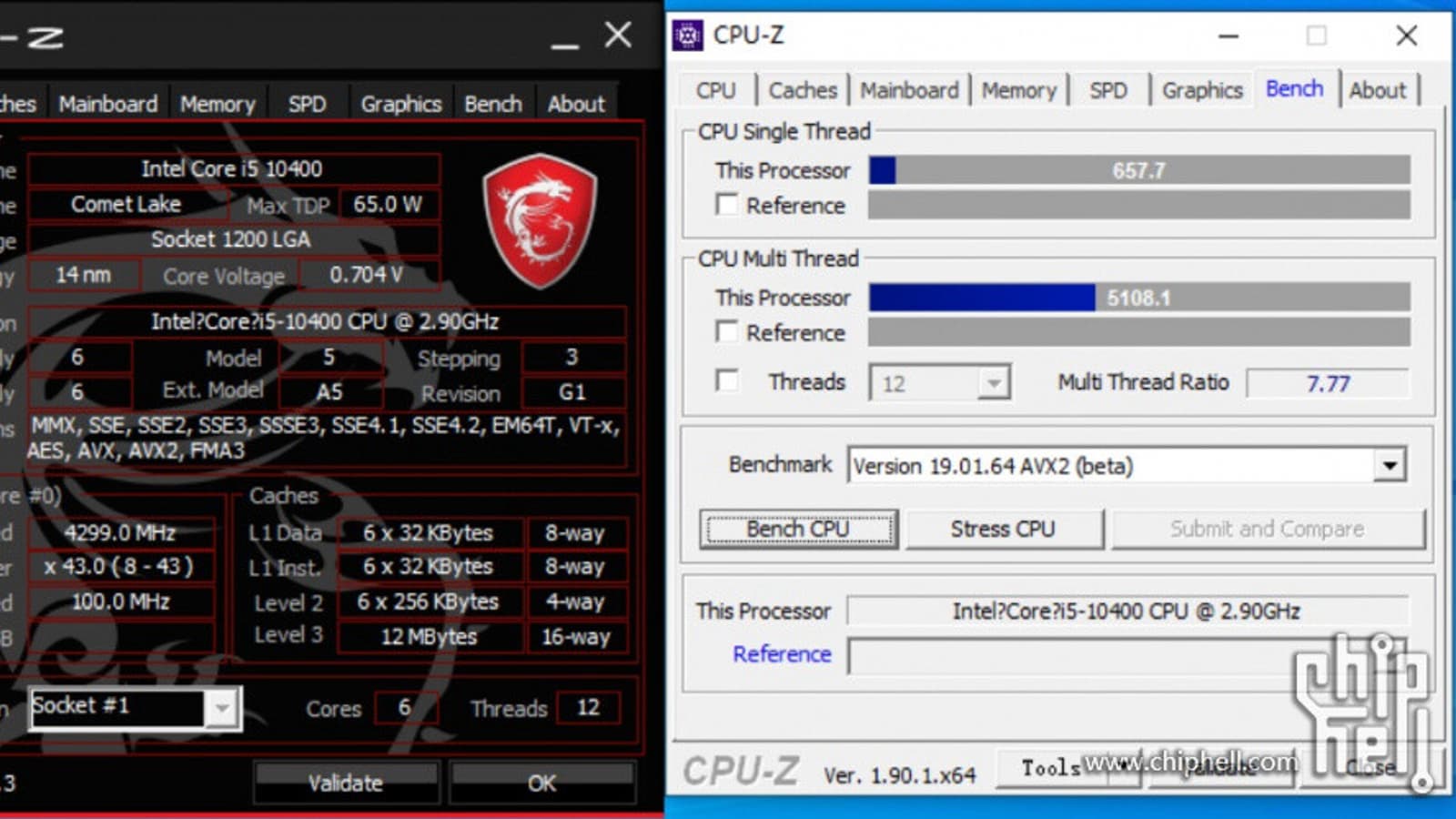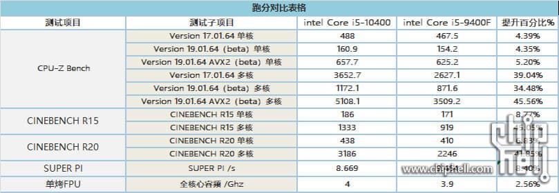 В сети появились тесты Core i5-10400 в сравнении с i5-9400F, включая Cinebench R15 и R20, CPU-Z Bench и SuperPi. Новый процессор демонстрирует незначительное (на 2-5%) увеличение производительности в однопоточных тестах, что отлично соответствует приросту максимальной частоты. Но в многопоточных тестах i5-10400 демонстрирует значительный прирост производительности: на 35-45% в CPU-Z, на 41,85% — в Cinebench R20 nT и на 45,05% — в Cinebench R15 nT. Если спроецировать результаты i5-10400 на Ryzen 5 3600X в многопоточных тестах Cinebench, можно констатировать, что прирост производительности может составить 10-15%.