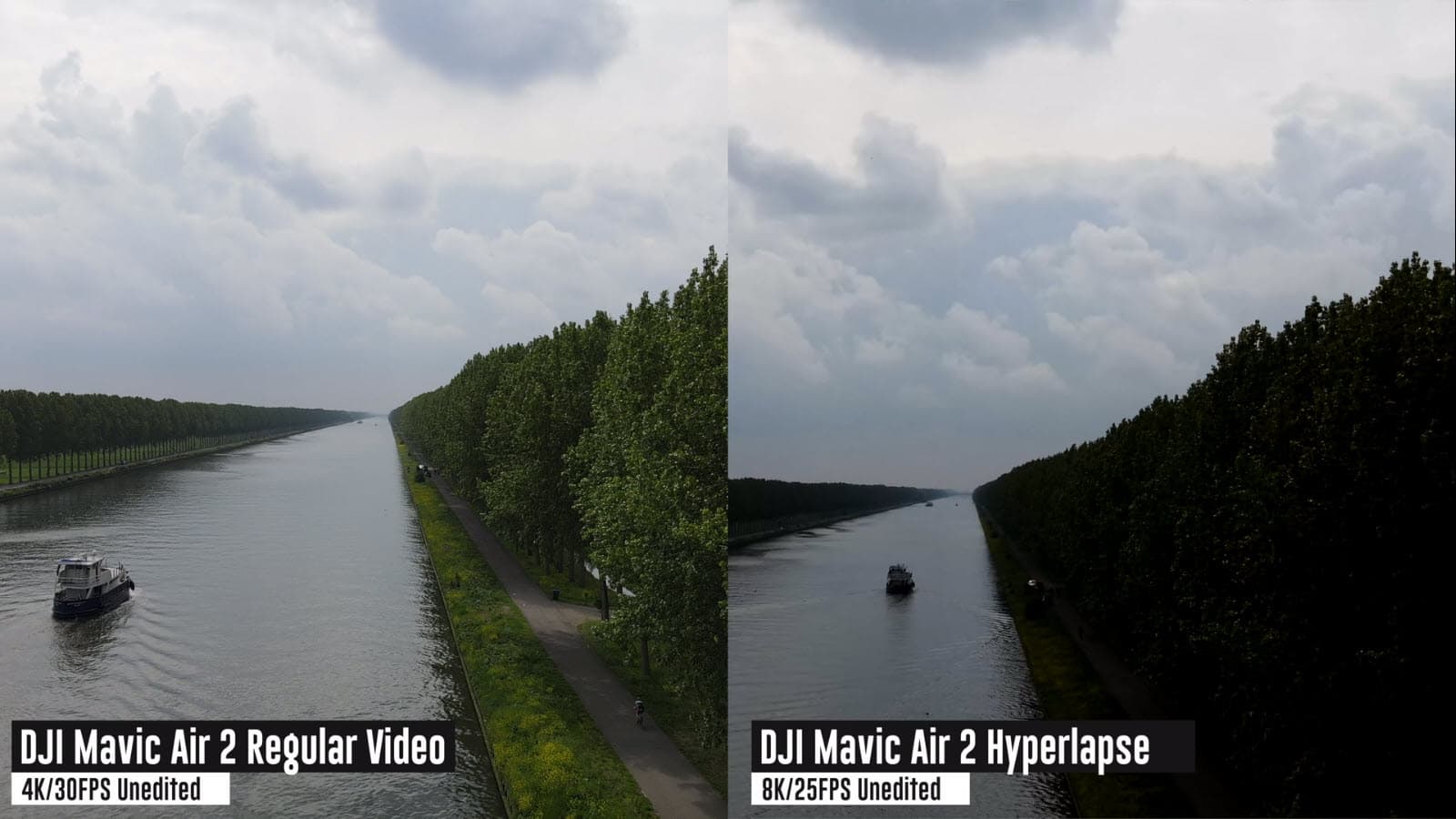 Mavic Air 2 получил камеру с 1/2-дюймовым датчиком разрешением 48 Мп, который позволяет создавать таймлапс-видео в разрешении 8K, однако в тестах было выявлено несколько проблем. Во-первых, итоговые видеоролики получаются очень нестабилизированными, изображение явно дергается. Кроме того, минимальный временной промежуток, через который дрон делает снимки в этом режиме при разрешении 8K, составляет целых 6 секунд, тогда как при выборе разрешения 1080р временной интервал составляет 2 секунды. По какой-то причине дрон не позволяет делать таймлапс-видео в разрешении 4K.