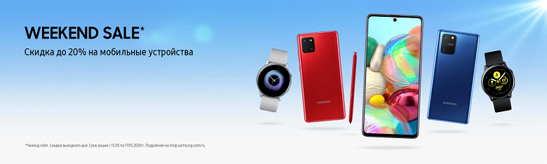 Также на выходные действует скидка на 20% на мобильные устройства по промокоду SUNDAYSALE. В ней участвуют смартфоны серий Galaxy Note10, Galaxy S10, Galaxy S10 Lite и Galaxy Note10 Lite, а также Galaxy A, планшеты, умные часы, включая новые Galaxy Watch Active2, а также беспроводные наушники. На новейшие флагманы серии Galaxy S20 дают скидку 10% по тому же промокоду.