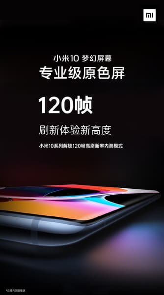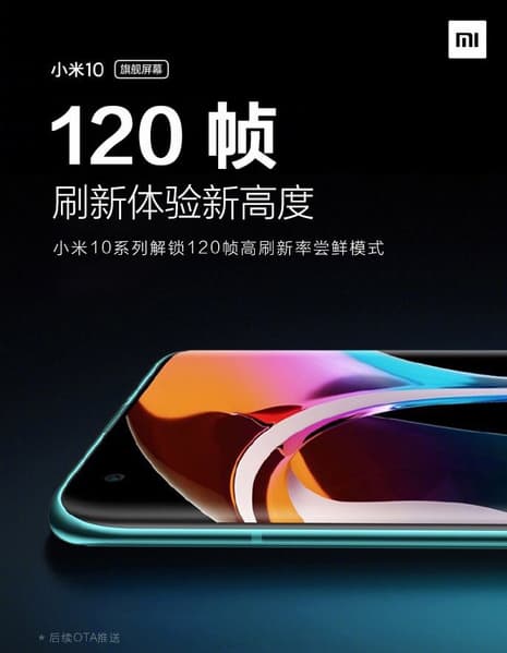 Постеры утверждают, что для смартфона Xiaomi Mi 10 будет выпущено обновление, которое повысит максимальную частоту изображения экрана до 120 Гц. Это обновление якобы должно было выйти в составе прошивки MIUI 12. Напомним, из коробки Xiaomi Mi 10 получил экран с частотой обновления изображения 90 Гц, а также с частотой опроса сенсорного слоя, которая составляет 180 Гц.