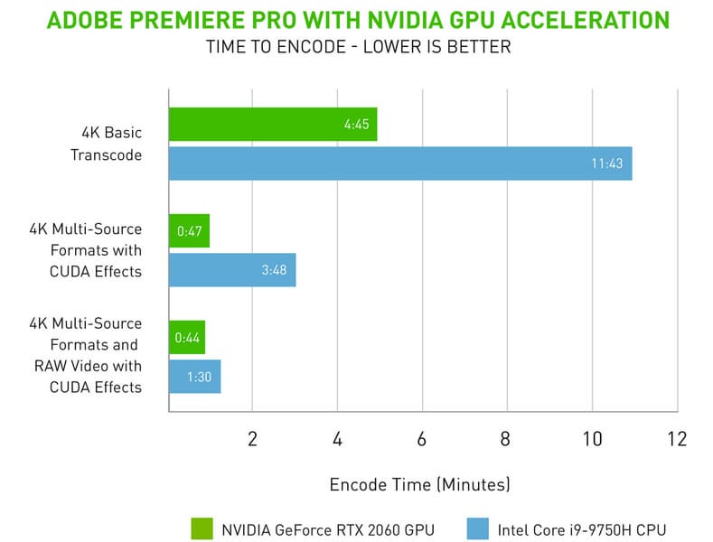 Компания Adobe на этой неделе выпустит обновление для приложения Premiere Pro, которое принесёт ему расширенную поддержку аппаратного ускорения GPU. Сама компания приводит в пример сравнение процессора Intel Core i9-9750H и видеокарты GeForce RTX 2060.