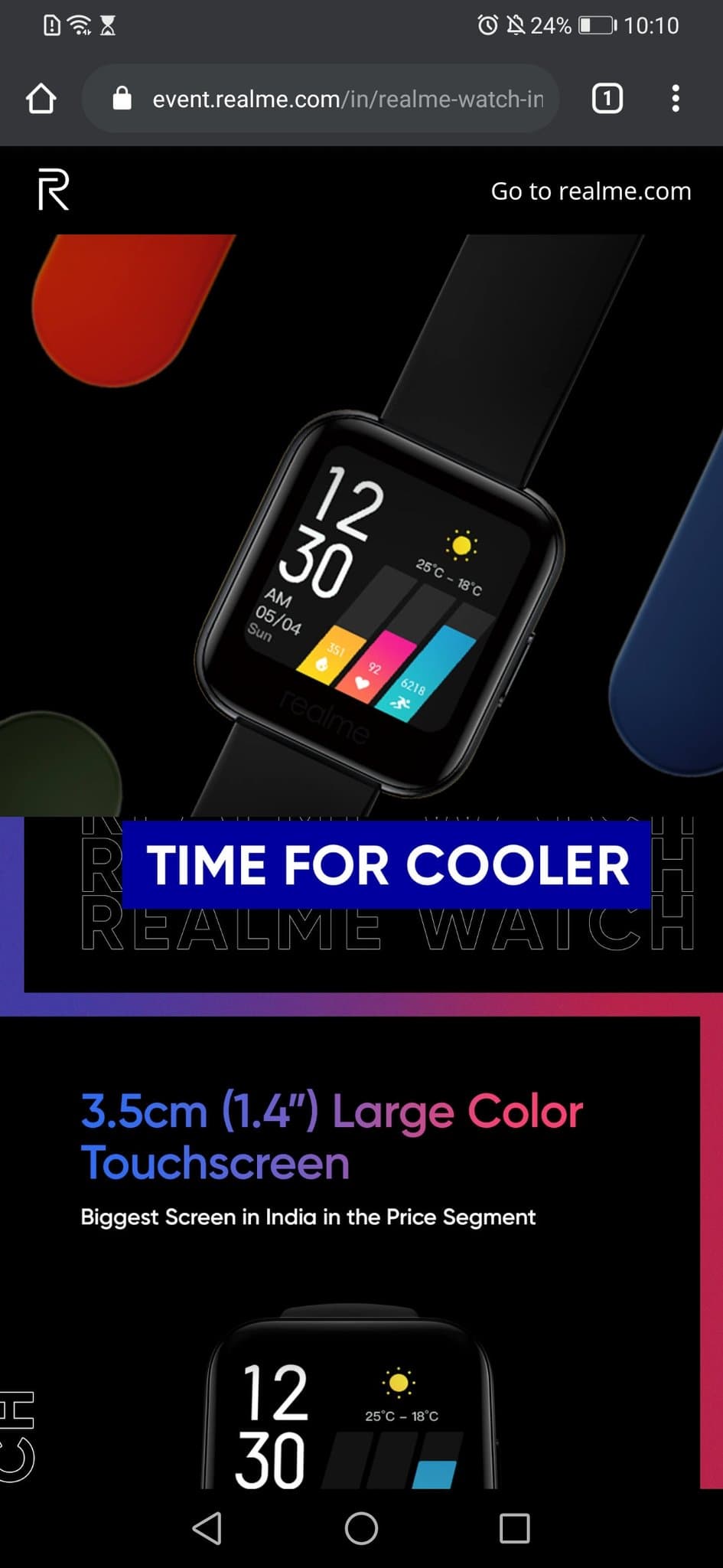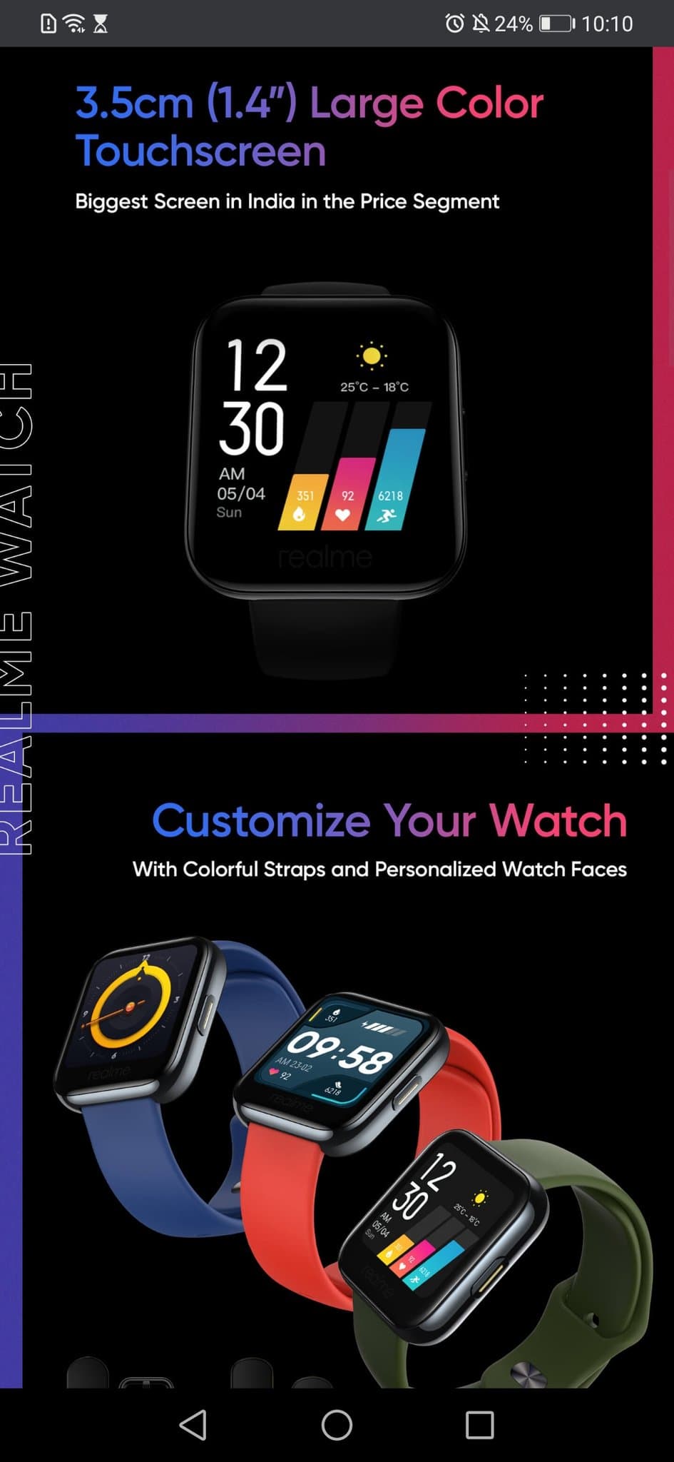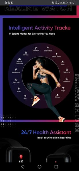 Часы показаны с разноцветными ремешками, которые, скорее всего, должны быть быстросъемными. Realme Watch будут отслеживать частоту сердечных сокращений в режиме 24/7, они смогут определять 14 видов физических упражнений.