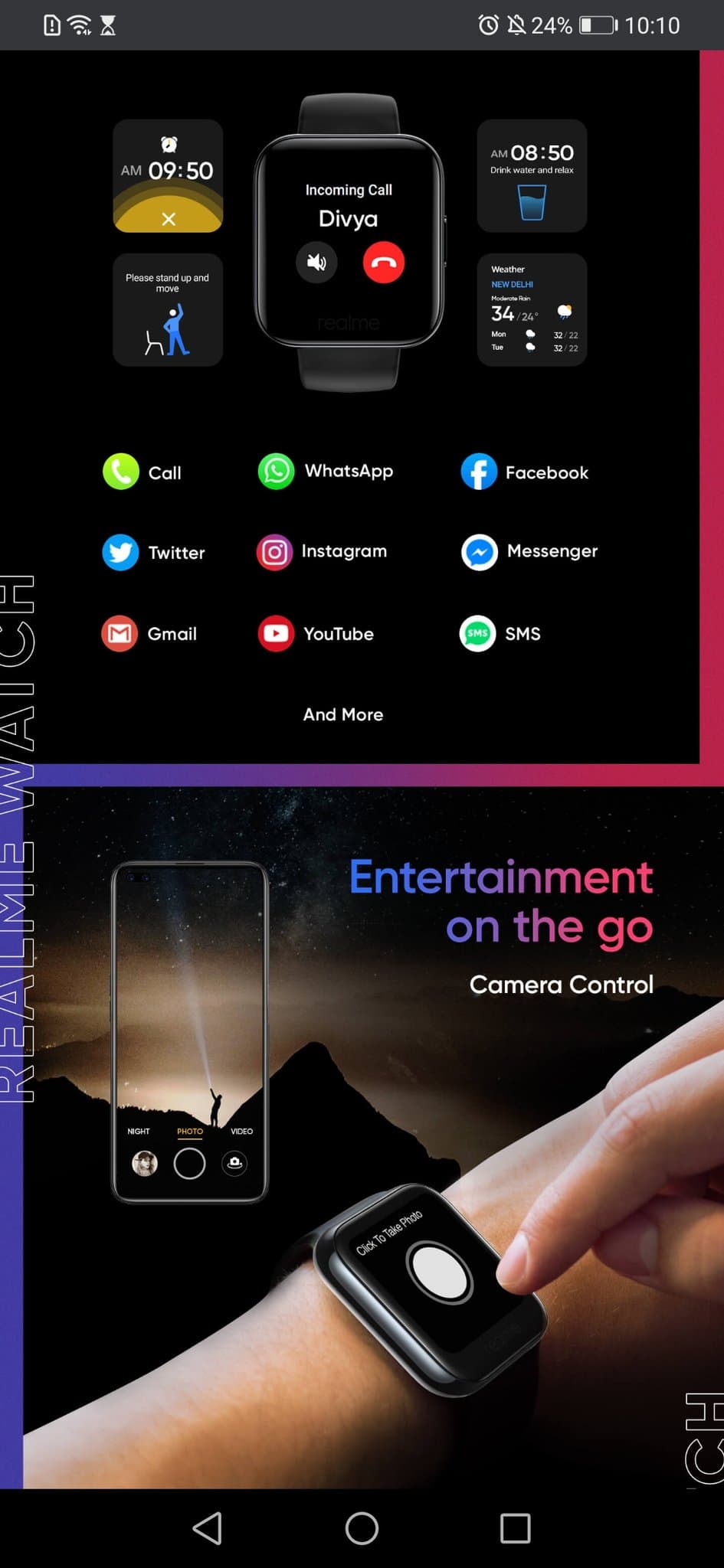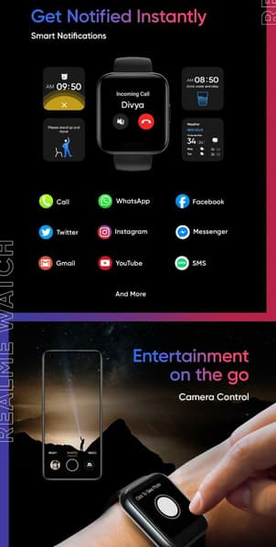 Realme Watch могут отображать дату, время, прогноз погоды, уведомления приложений (поддерживаются YouTube, Twtter, WhatsApp, Facebook, Instagram и прочие популярные приложения), информацию о звонках и сообщениях, они напомнят вам, когда нужно выпить воды, когда стоит встать и размяться и так далее.