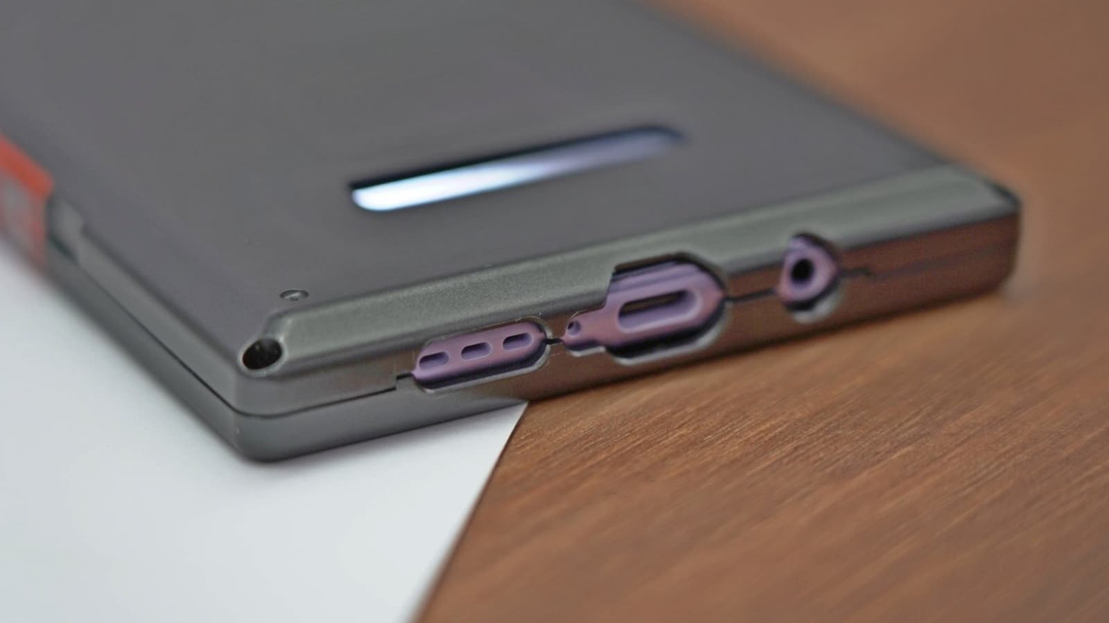 Однако кое-какие детали фотографии все равно позволяют рассмотреть. На нижней панели устройства располагаются вырез громкоговорителя, а также разъемы USB-C и 3,5 мм для подключения наушников. На верхней панели находятся два выреза для микрофонов.